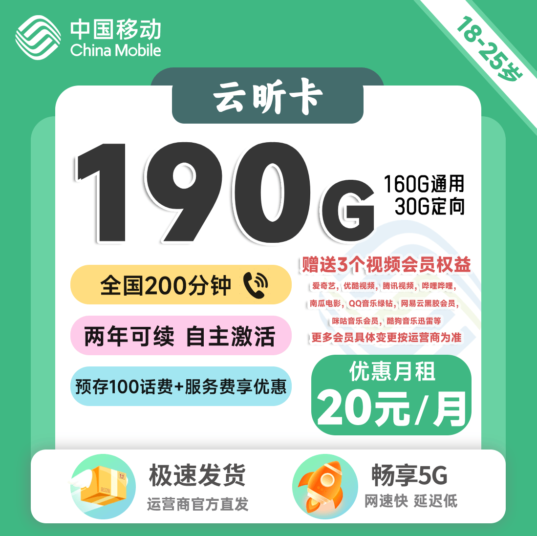 20元190G全国流量+200分钟通话+3个会员(芒果+咪咕+会员权益N选一)