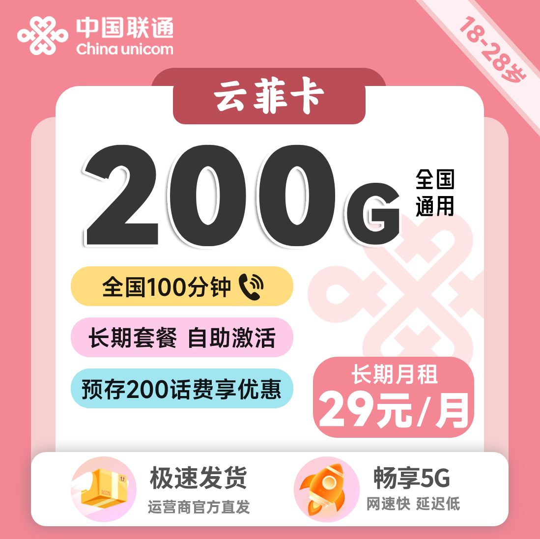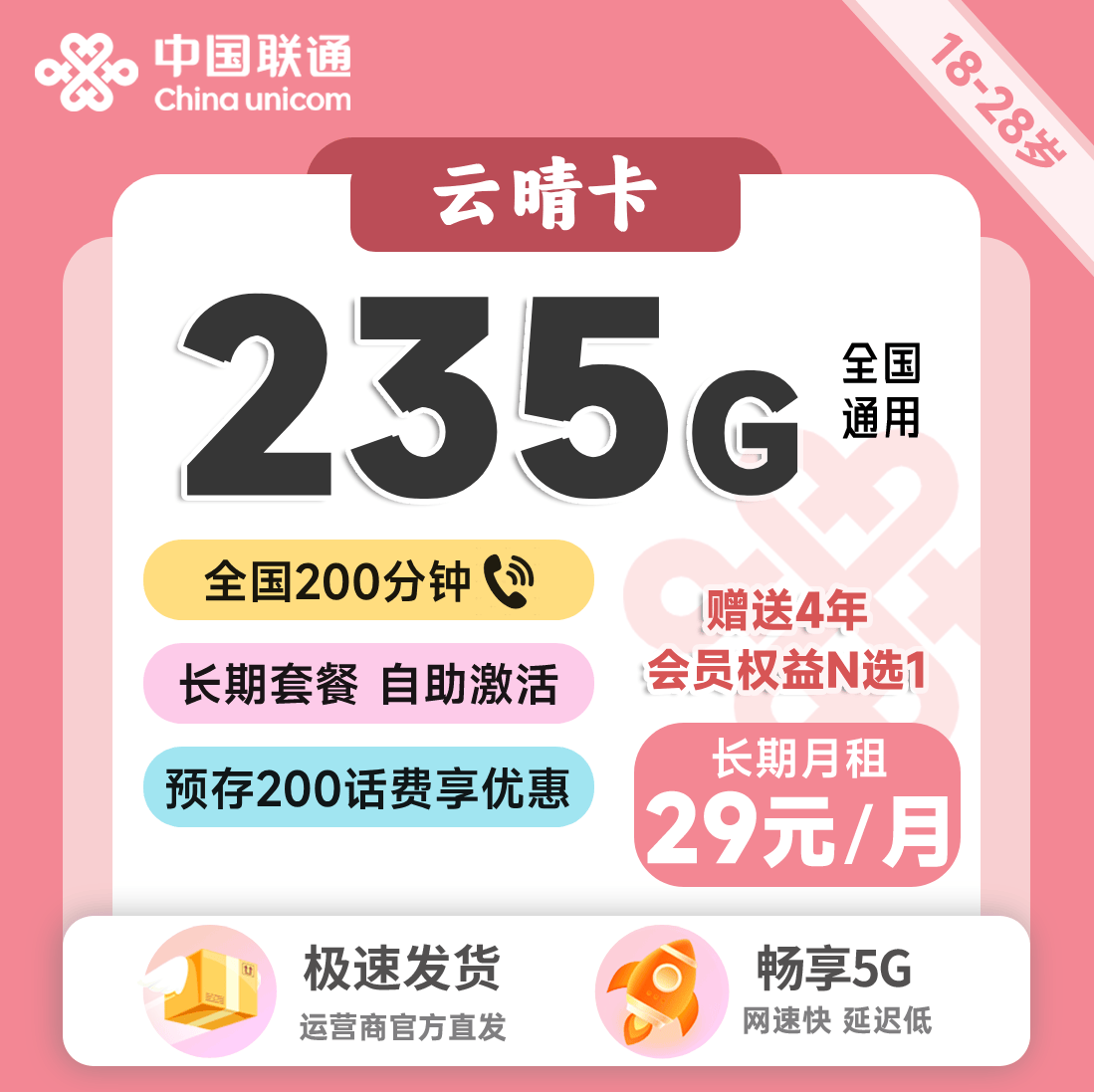29元235G全国通用流量+200分钟通话+会员权益N选一