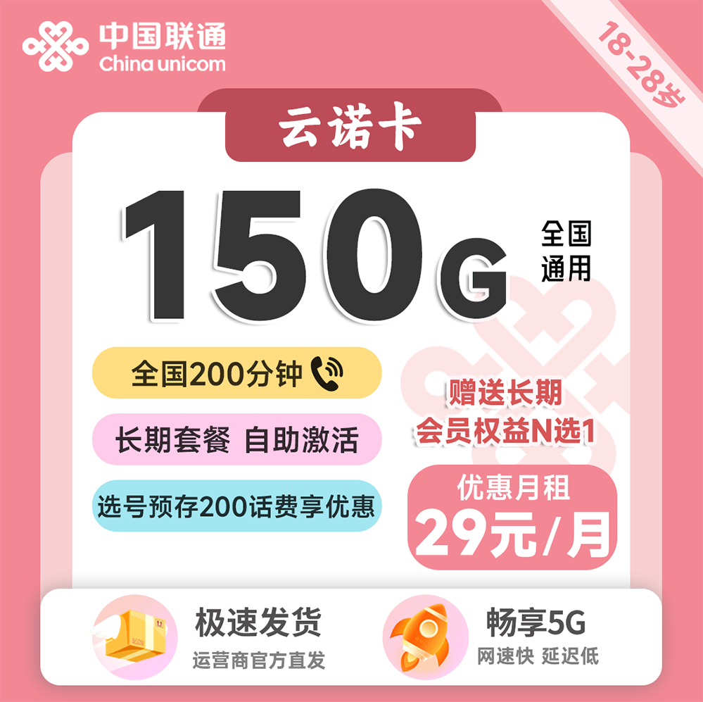 29元150G通用+200分钟+会员权益