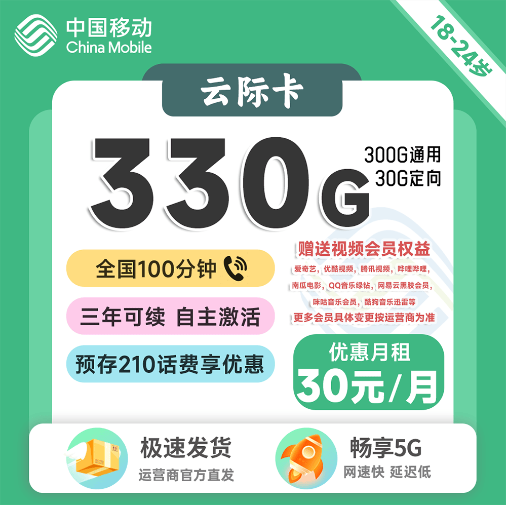 30元330G全国流量+100分钟+会员权益N选一(发全国到付)